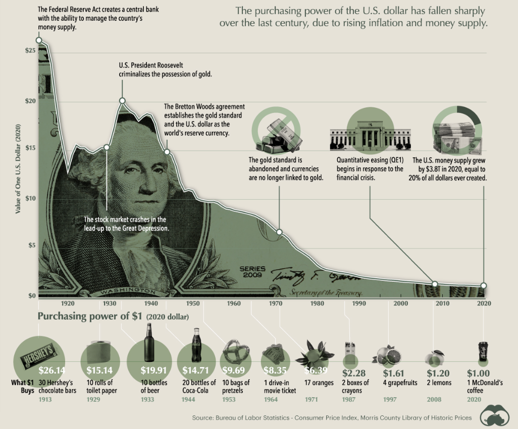 Once upon a time, a dollar could buy you a movie ticket, popcorn, and a soda. Today, that same dollar might get you a side of ranch dressing if you’re lucky. Since the Federal Reserve was created in 1913, the dollar has lost over 96% of its value. That’s right—96%. This isn’t just some abstract figure; it’s a slow bleed that’s been draining our wallets for over a century.